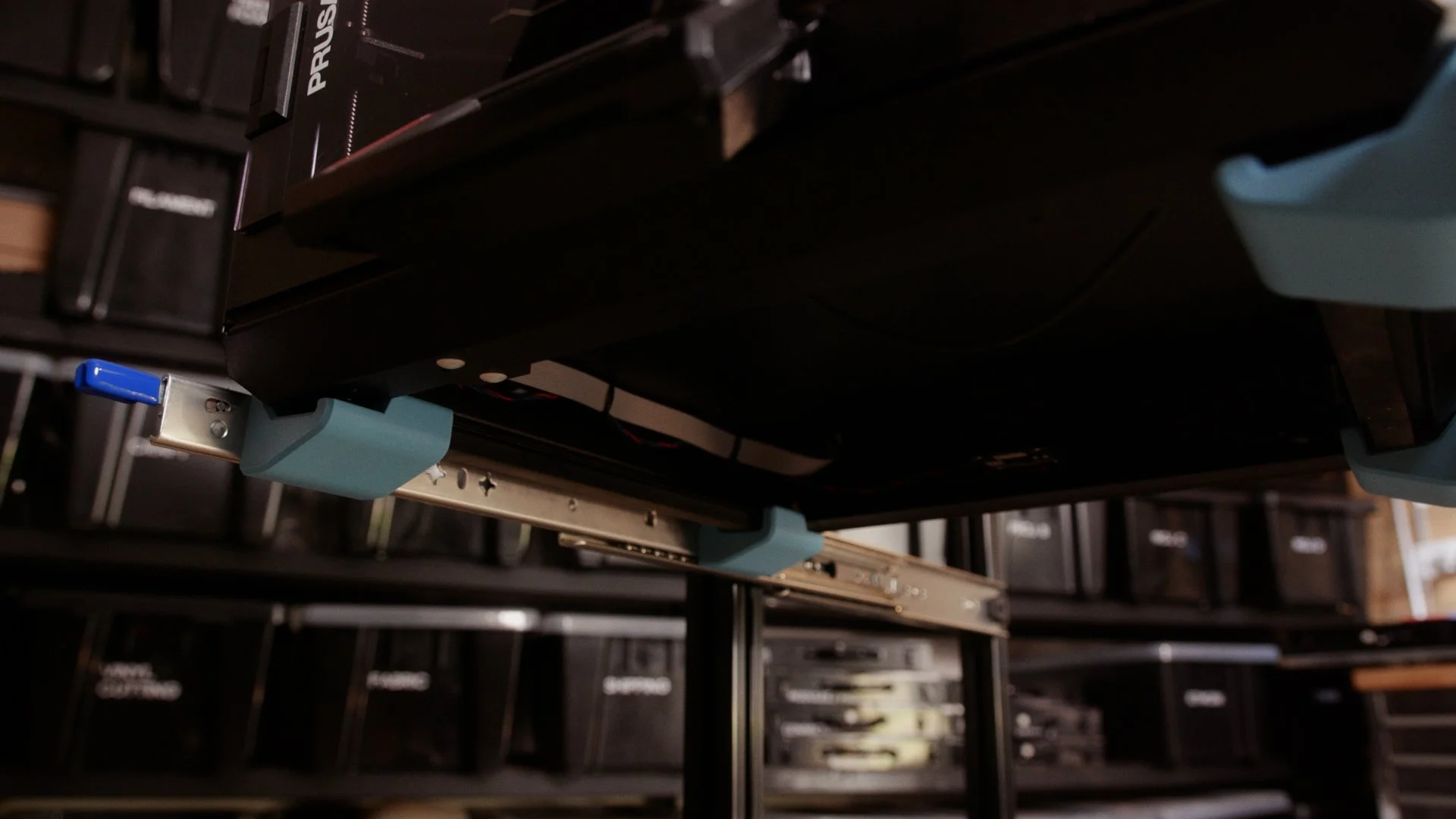 To solve that, each printer sits on a pair of locking drawer slides. When I need to change filament, the whole printer simply slides out like a drawer. Once the filament is loaded, it slides back in and locks into place.