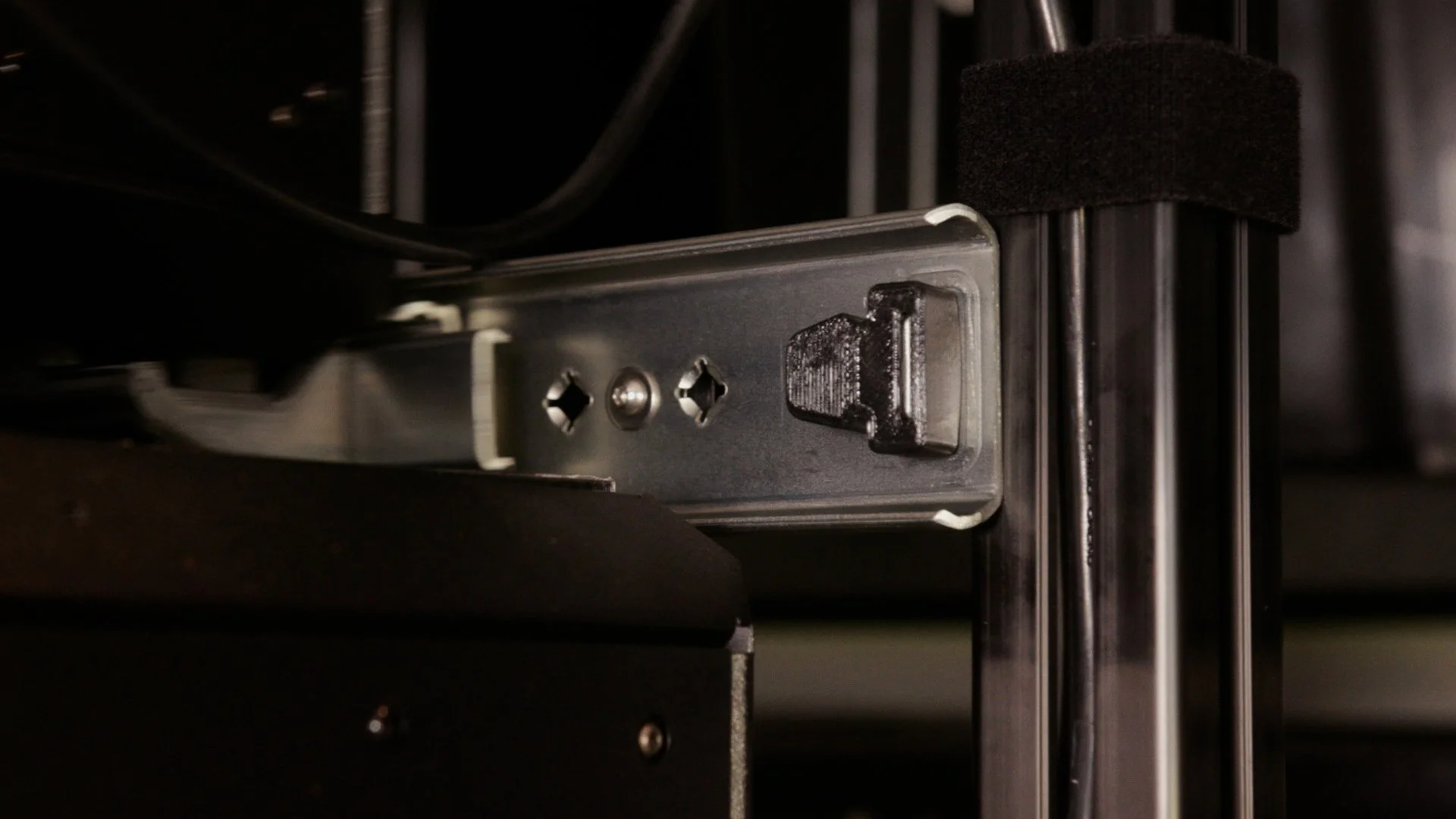 Instead of using shelves, the printers are supported by a set of 3D printed mounting clips that hook directly onto the Core One’s steel frame. Four corner clips hold the printer in position, and additional centre clips wrap around the frame to prevent any movement.