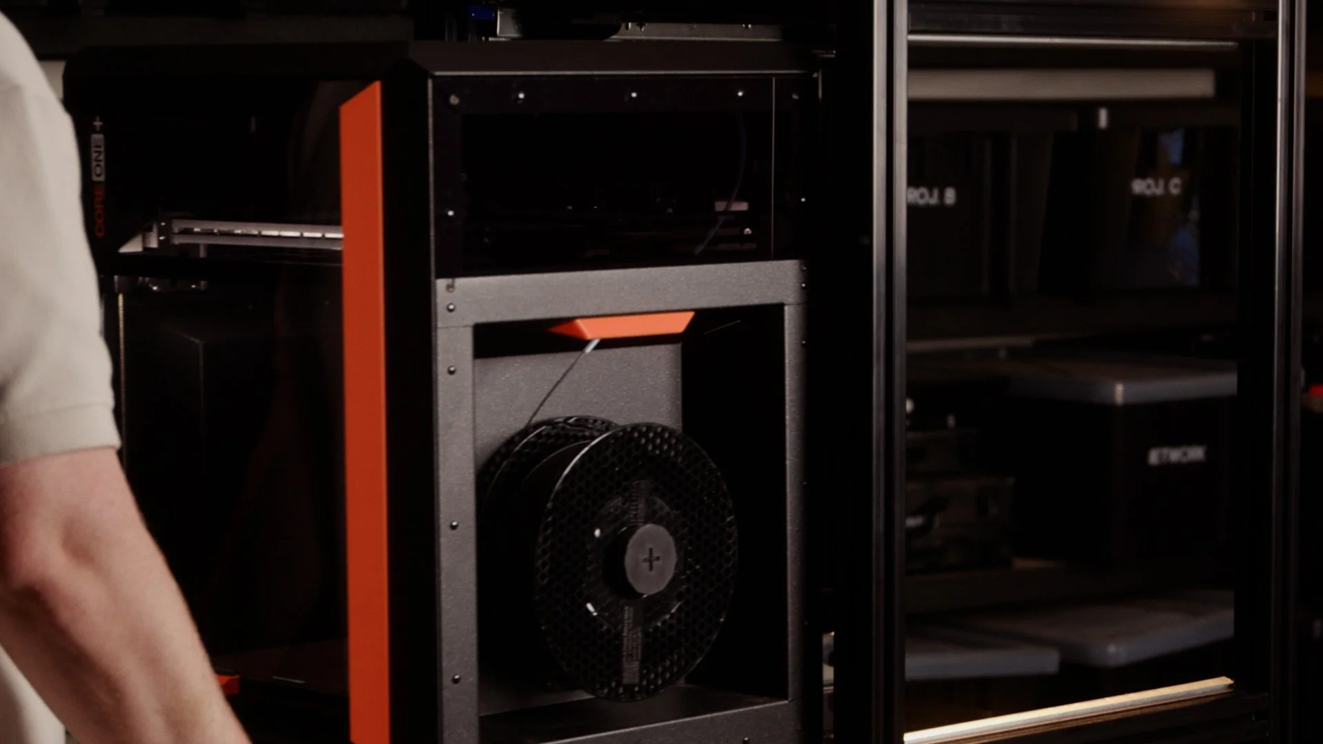 But stacking printers introduced another problem: filament access. The spool holder on the Core One sits on the right-hand side, which would normally be blocked by the frame or other shelving next to it.